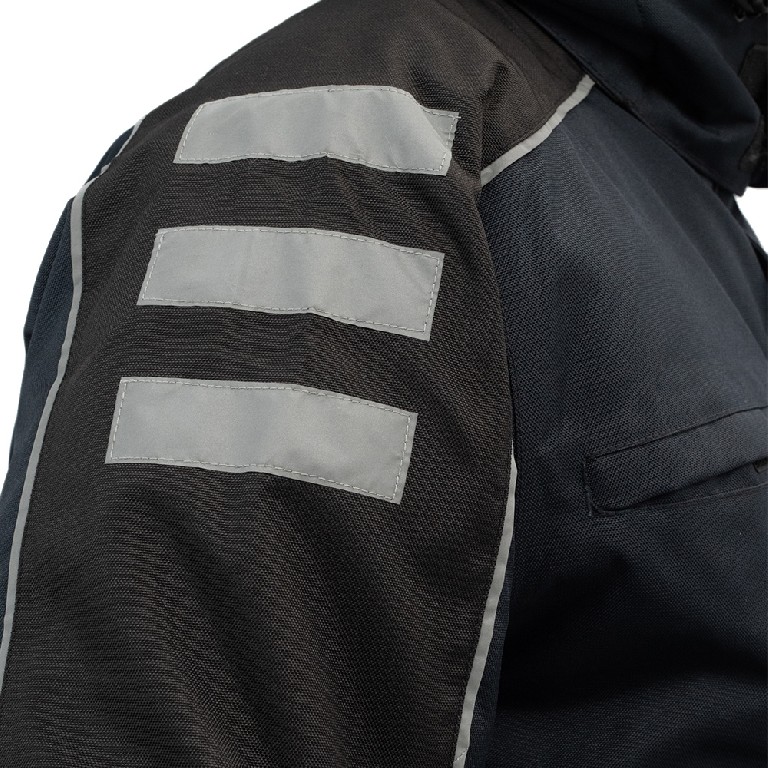 На рукавах и нижних накладных карманах – нашивки из светоотражающей ленты.
