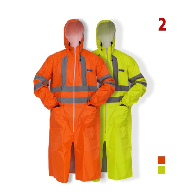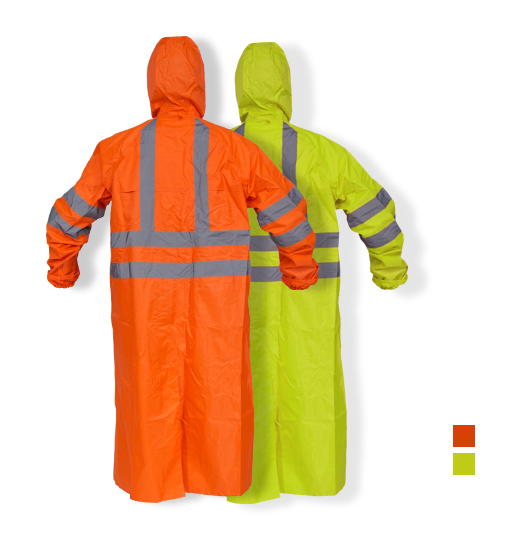 1. Плащ изготавливается из ткани ярко-оранжевого и ярко-лимонного цветов. Имеет светоотражающие полосы. Соответствует 3-му классу по ГОСТ Р 12.4.219-99 «Одежда специальная сигнальная повышенной видимости».